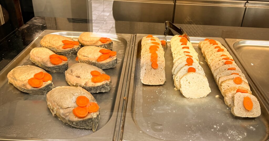 אײדל און איך האָבן אױסגעקליבן אַ באַקאַנט אַשכּנזיש עסן — אַ בײגל — נאָר דער בוכאַרער קוכער האָט דערױף געשאַפֿן אַ קולינאַרישע מישונג לױט אונדזער פּערזענלעכן געשמאַק. אײן זײַט פֿונעם בייגל האָט ער באַשמירט מיט שמירקעז, װי מע עסט עס אין קװינס, נ״י, און אױף דער צװײטער זײַט — כומוס, אַזוי װי מע עסט עס אין בוכאַרישן קװאַרטאַל פֿון ירושלים. דערצו האָט ער אַרײַנגעשטאָפּט גרינסן אַזױ װי אין אַ באָסנישן קעבאַב־הױז דאָ אין װין — און באַגיסט אַלצדינג מיט שאַרפֿן סאָס אַזש פֿון בוכאַראַ. מיר נעמען מיט די געשטאָפּטע, זאַפֿטיקע בײגל אין זעקלעך און זוכן אין דרױסן אַ זוניק אָרט צו עסן.